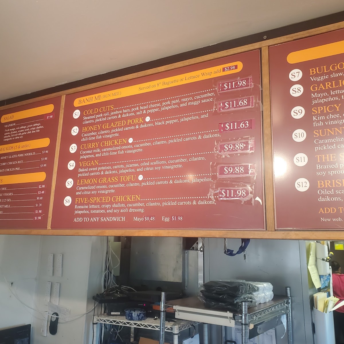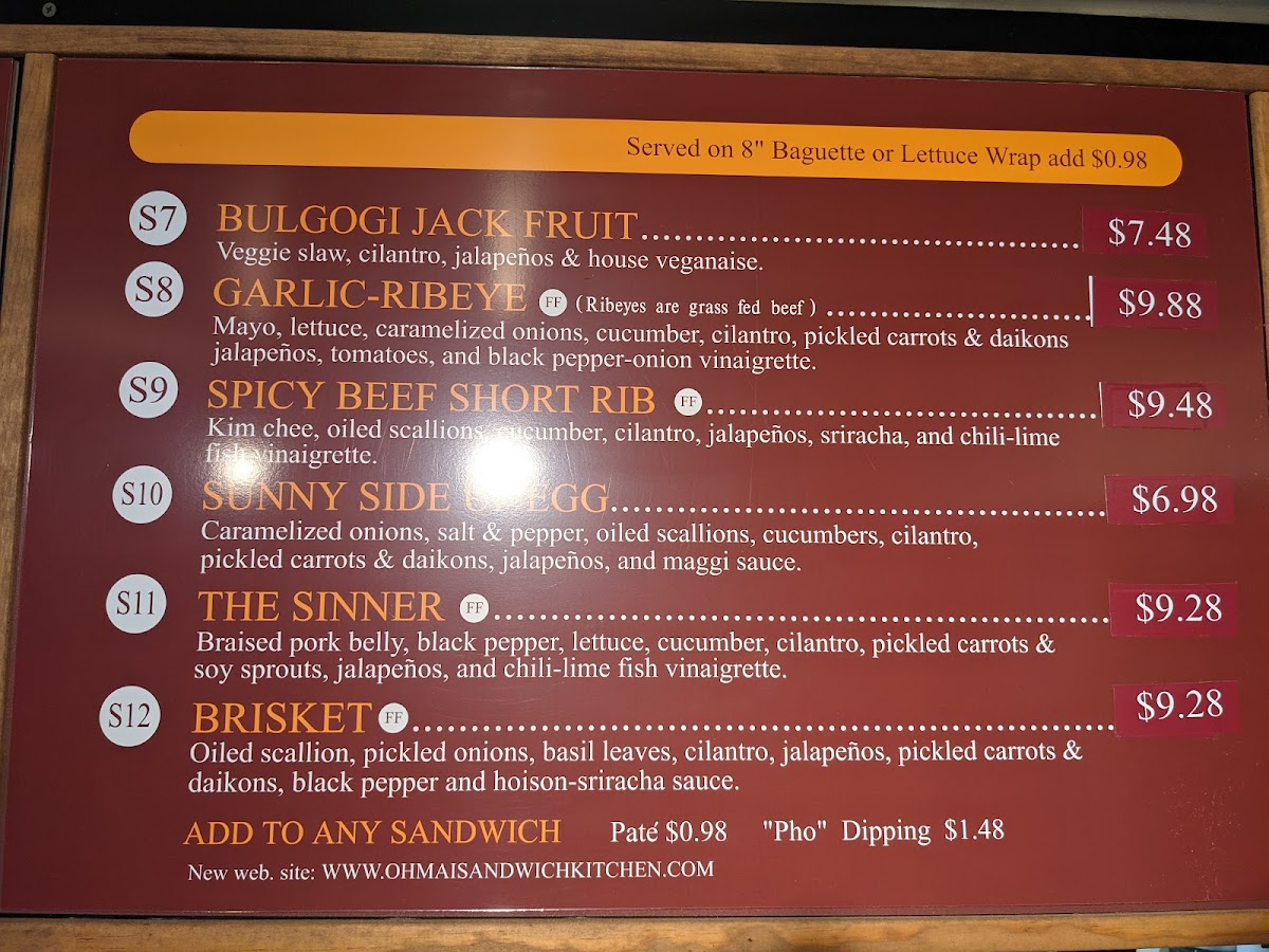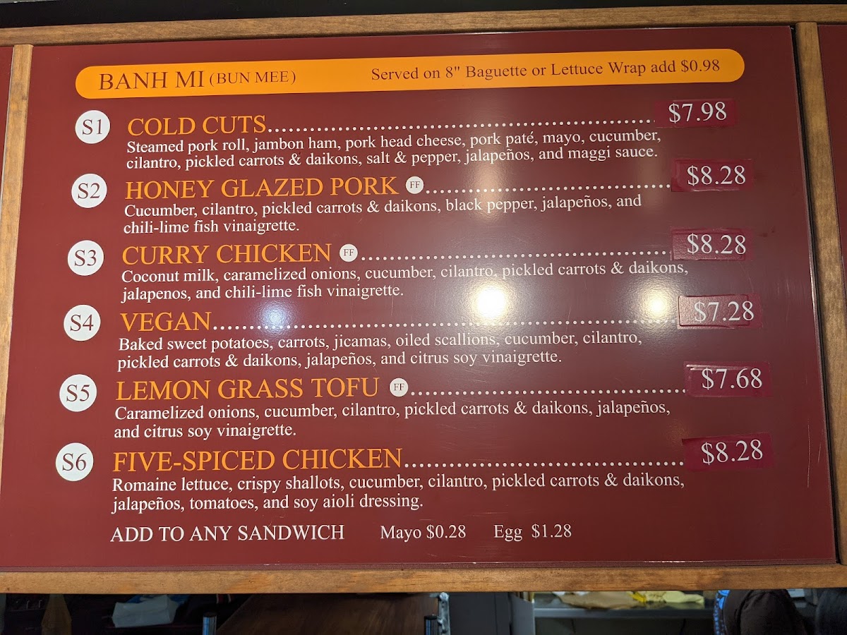 Steamed pork roll, jambon ham, pork head cheese, pork pate, mayo, cucumber, cilantro, pickled carrots & daikon, salt & pepper, jalapenos and Maggi sauce