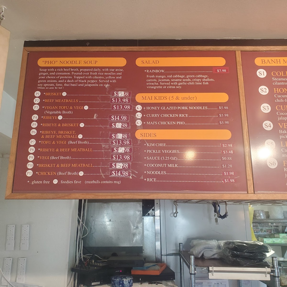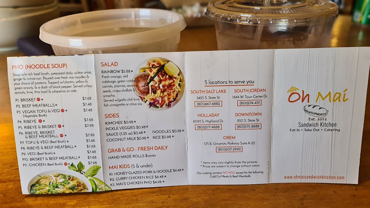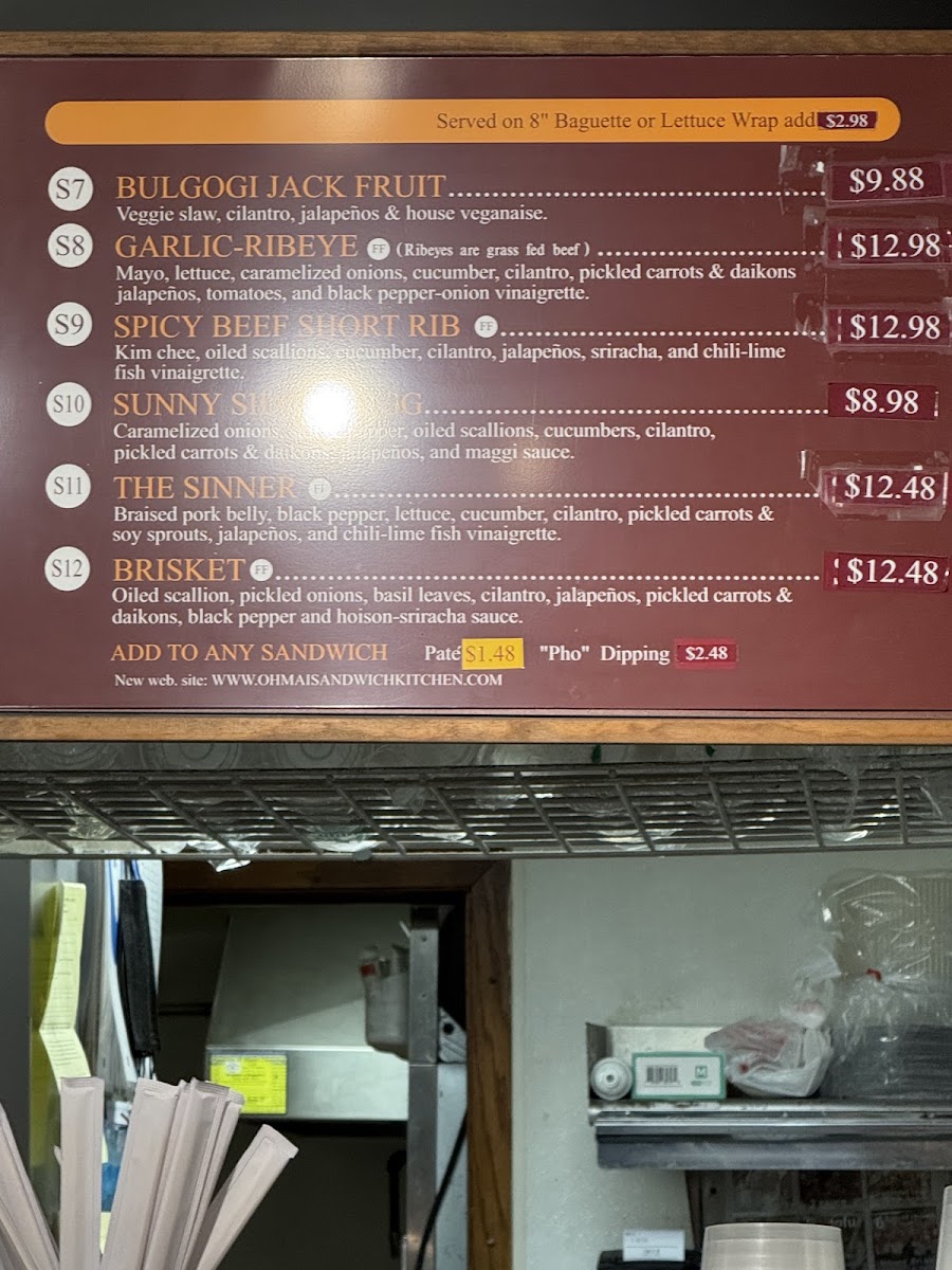 Steamed pork roll, jambon ham, pork head cheese, pork pate, mayo, cucumber, cilantro, pickled carrots & daikon, salt & pepper, jalapenos and Maggi sauce